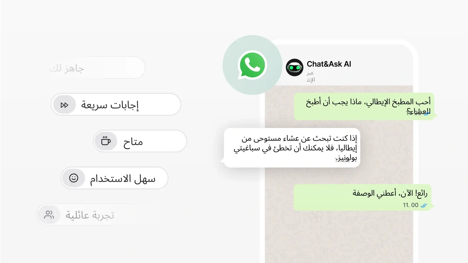 تحدث مع مساعد Chat & Ask AI على واتساب! احصل على إجابات سريعة واستمتع بتجربة تفاعلية ممتعة مع روبوت الدردشة.