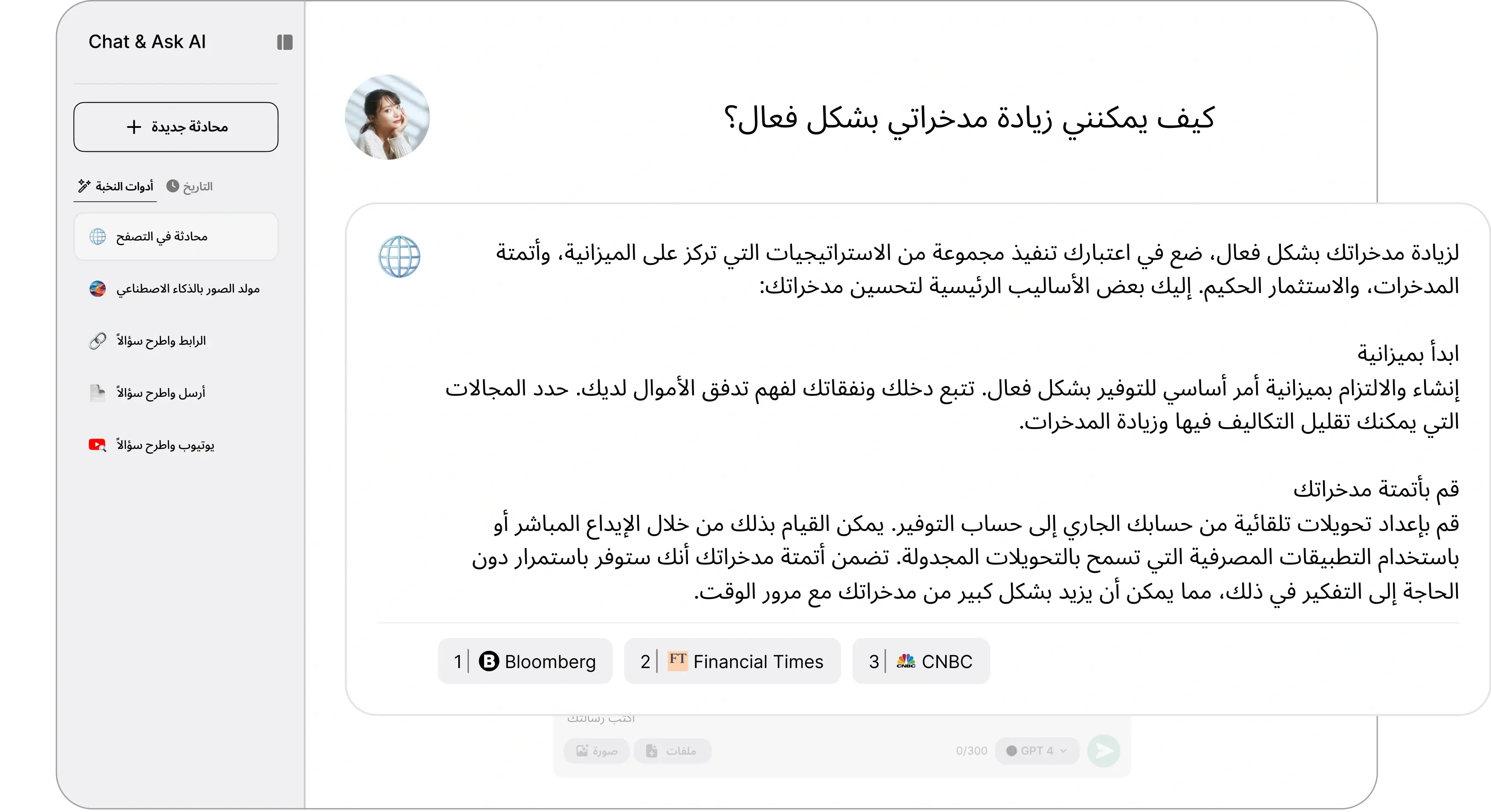 حل شامل لمجموعة واسعة من المهام. ترجم اللغات، حلل البيانات، أنشئ المحتوى، أو خطط لرحلاتك – Chat & Ask AI هنا لمساعدتك.