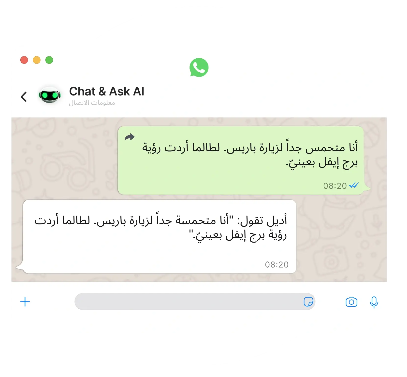 تم دمج Chat & Ask AI بسلاسة مع واتساب، ليكون دائمًا على بُعد رسالة واحدة فقط!