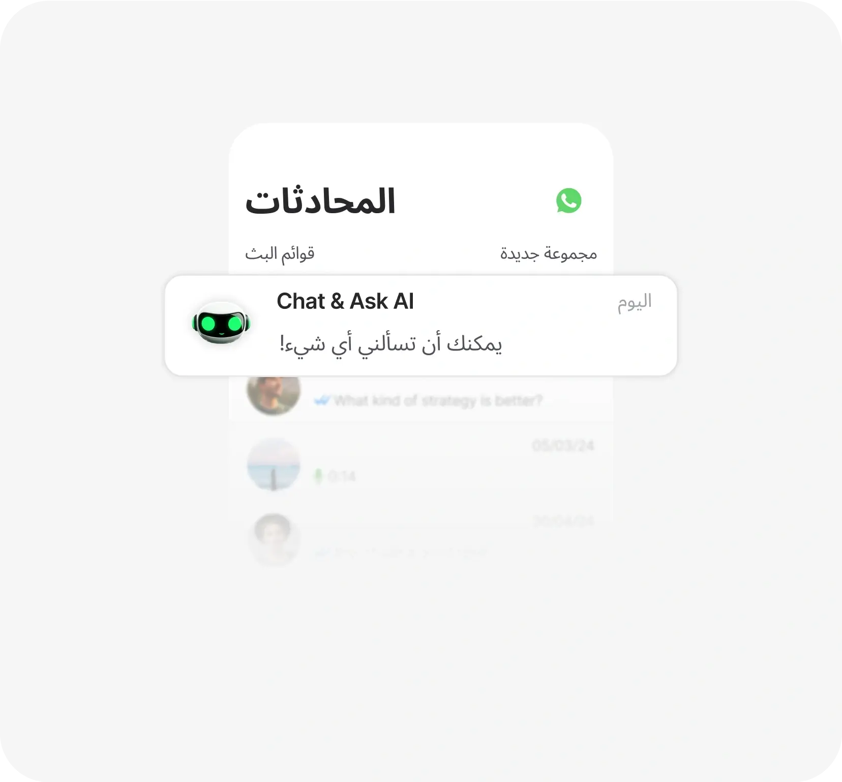 نحن بجانبك أينما كنت. تواصل مع مساعد Chat & Ask AI على واتساب واحصل على إجابات فورية لأسئلتك. سواء في العمل أو أثناء التنقل، الذكاء الاصطناعي دائمًا على بُعد رسالة واحدة لمساعدتك. 🚀