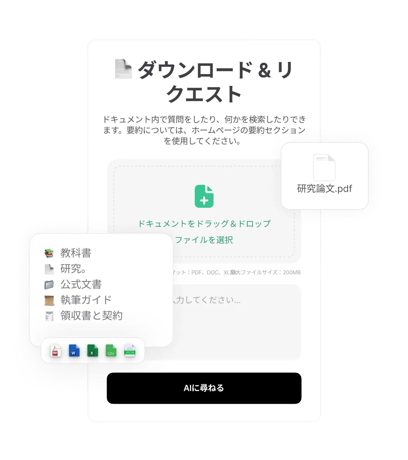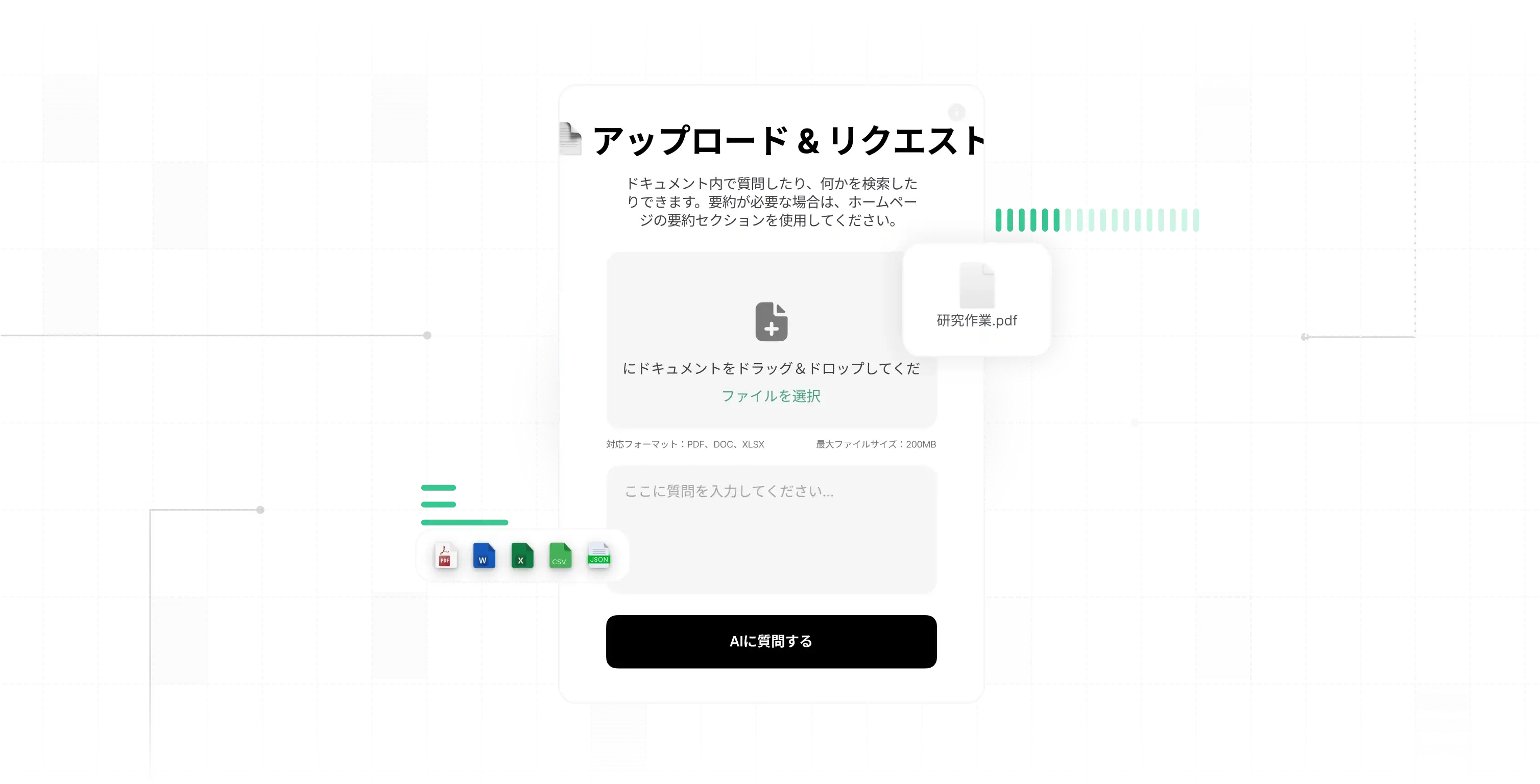 あらゆるドキュメントを要約し、質問に即応。PDF・Word・Excelなどをアップロードして、詳しく・素早く回答を取得。