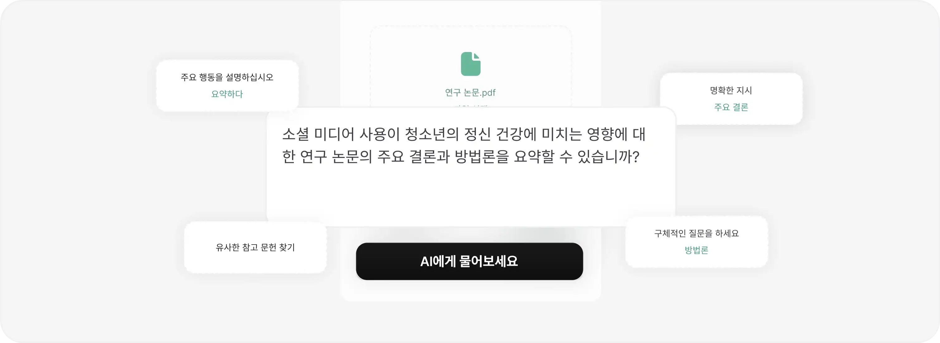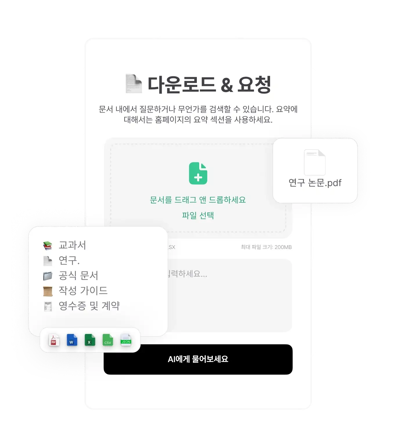 어떤 문서든 Chat & Ask AI로 요약하세요! AI PDF 요약기를 통해 PDF, Word, Excel 등 파일을 업로드하면 빠르게 상세 답변을 받을 수 있습니다. 문서에 대해 질문하고 신속하고 포괄적인 응답을 받아보세요.